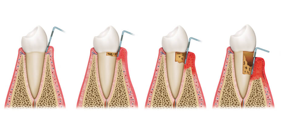 Eine Parodontitis ist eine chronische Erkrankung, wird durch Bakterien in den Zahnbelägen (Plaque) verursacht und beginnt mit einer Zahnfleischentzündung. Die Erkrankung verläuft meist ohne deutliche Schmerzen. Da aber mehrere Millimeter tiefe Zahnfleischtaschen entstehen können, führt sie unbehandelt zu Zahnlockerungen, zu freiliegenden Zahnhälsen und im fortgeschrittenen Stadium zum Zahnverlust. Je früher sie erkannt wird, desto besser kann sie behandelt werden. Ziel ist es, den Knochenabbau am Zahnhalteapparat möglichst früh zu stoppen.